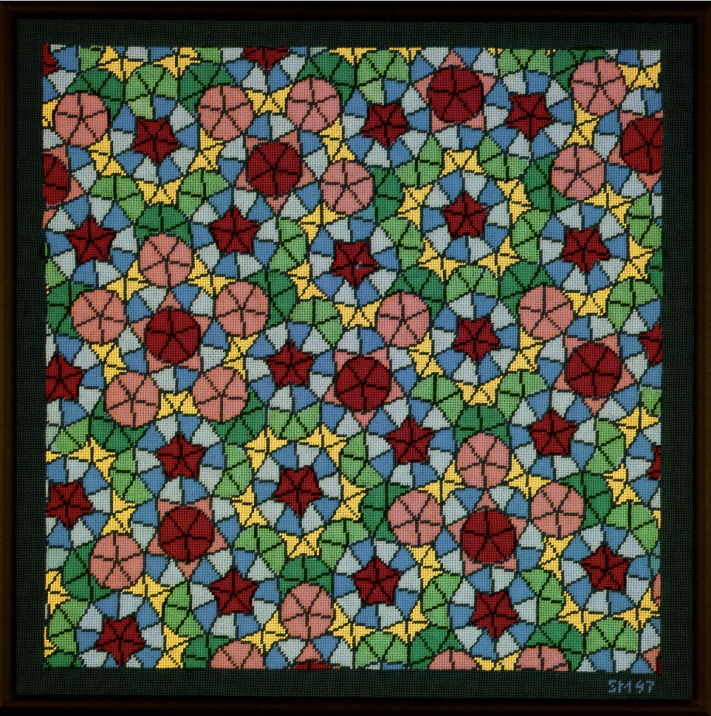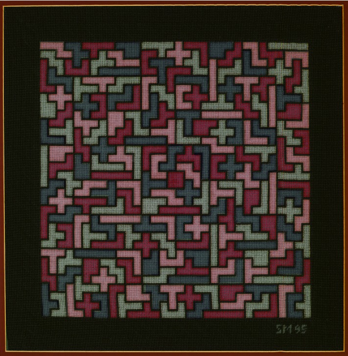 This is my very first needlepoint. It won a blue ribbon for original design at a Marin County show. My IMSAI 8080 kit computer solved the pentomino puzzles, but the overall design was done using little squares of paper on a greased up board. After this project, I was very busy in my career, and did not do another needlepoint for 13 years.