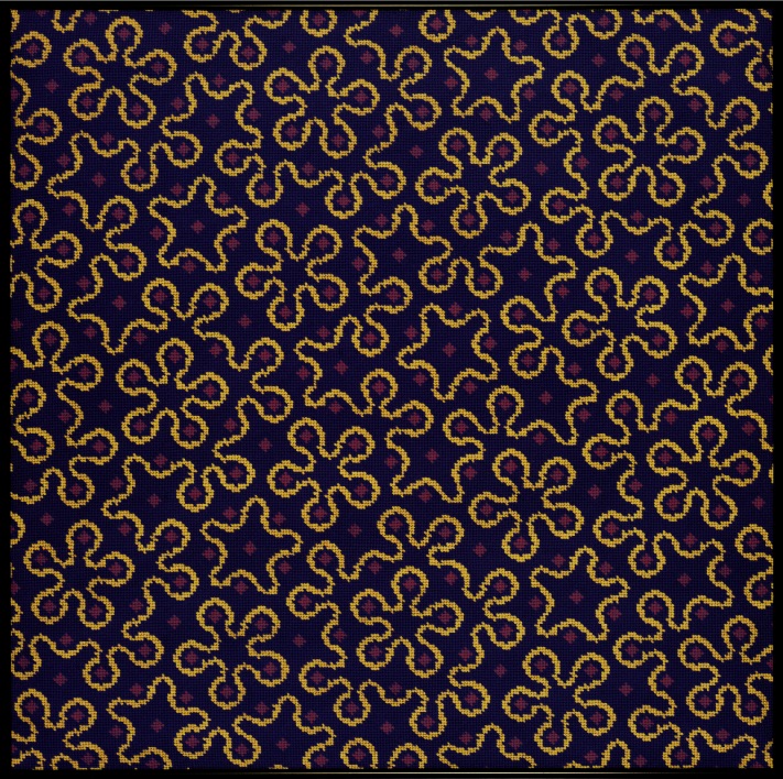 This was my first attempt at a Kites and Darts theme. This design is an attempt to fill as large an area as possible. The coloring emphasizes small symmetrical areas, as well as highlighting the non-symmetric connections between them. One can pick out larger symmetries, and is left imagining how these larger symmetries are connected.